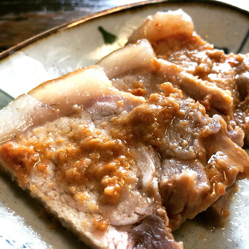 もろみ味噌ダレに豚ロースのブロックをまるごとつけて味付しました。