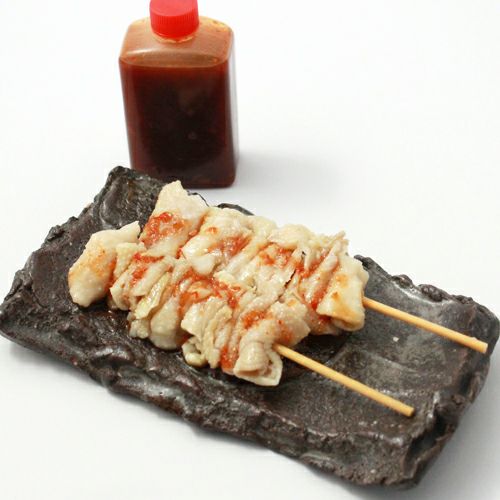 やわらかくスチームした鶏皮を串にさしました。鶏皮串はみんなに人気!