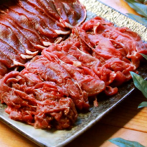 ※↑の写真の左側が馬肉で右側は鹿肉のしゃぶしゃぶ用肉となります。(馬鹿鍋)