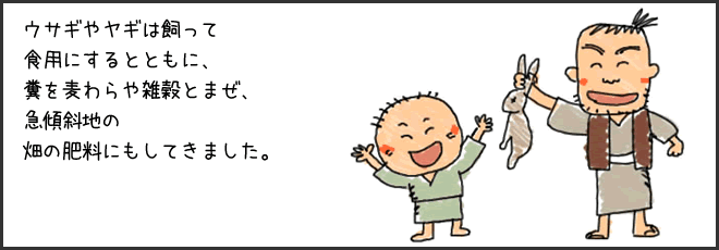 野生動物との関わりも当然古いゆえ、狩猟の聖地とも呼ばれており、野生の鳥獣肉を表す、「山肉(やまにく)」という当地域特有の古い言葉も今もって生きている言葉として使われ、「シシの肉を喰わぬうちに、うまいもの喰ったと言うな」ということも昔から口から口へ伝えられてきています。