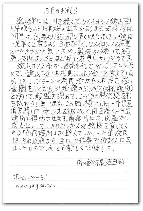 7月のお便り 短めの梅雨が終わりました。 遠山郷は、雨の日は少なかったけど、 全体の雨量は多い気がします。 さて、梅雨が明ければ、土曜のウシ。 オラの子供の頃、お肉を食べられるのは、 何 ≫続きを読む