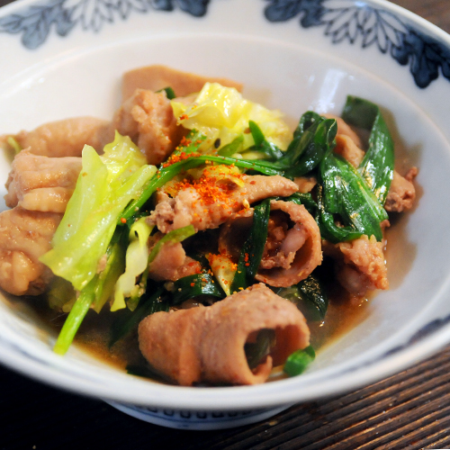 よく水洗いした豚のホルモンにジンギスカンのタレをからめました。