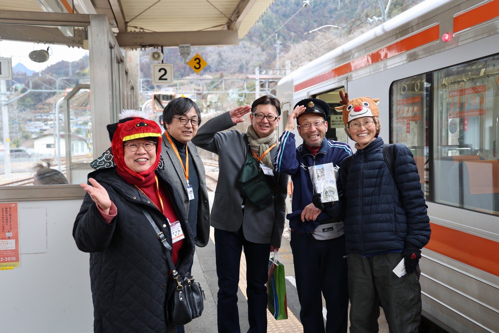 今回参加した大學の事務局メンバーは、カレーの大原屋店主の尾澤あきらさん(飯田市)、飯田線ライターの神川靖子さん(水窪町)、スズキヤ若女将(副社長)の鈴木志保(飯田市)、三遠南信Biz編集長の河原俊文さん(飯田市)、そしてわたし(飯田市)の5名。午前7時5分飯田発の上り普通列車に、各自が最寄り駅から乗り込んで合流しました。