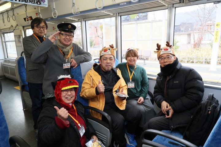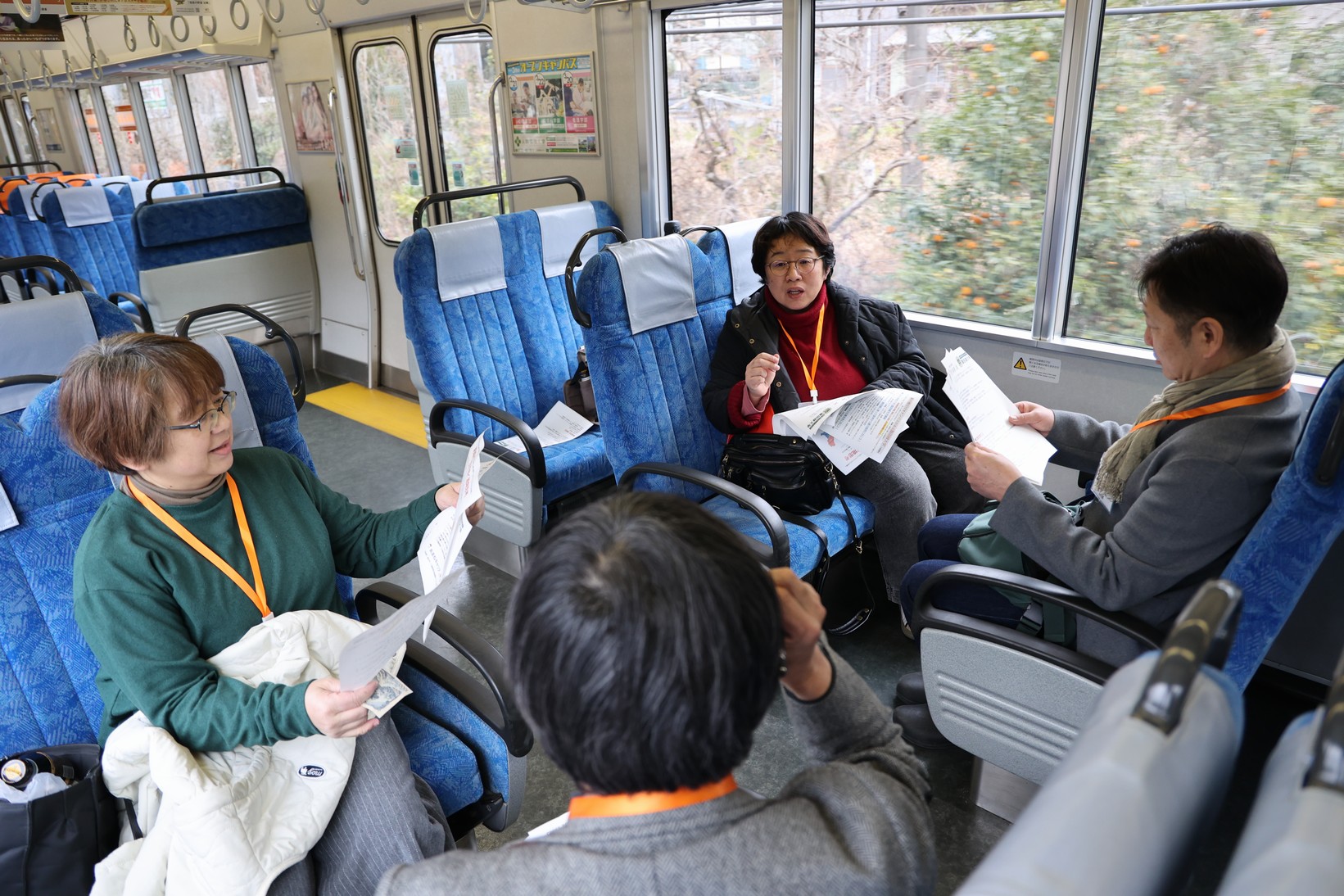 水窪駅で神川さんが乗車し、5人がそろったところで車内会議。